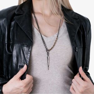 Single Spike Adjustable Necklace in Dual Tone Gunmetal Elevate Your Style with Our Subtly Striking Necklace: Featuring a single solitaire spiked pendant with rhinestones encrusted micro-pave style on a dual-tone gunmetal and gold-tone overlay chain. Lays about 24-26" long and complete with an adjustable length clasp. Plus, a super-cute guitar pick charm detail by Hard…