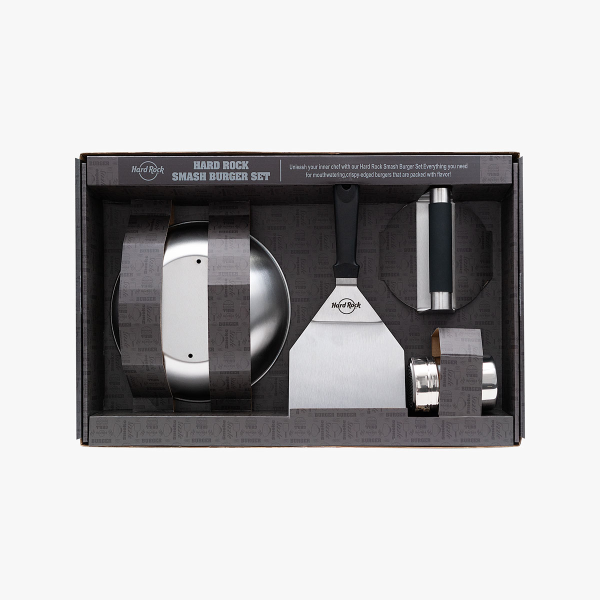 Your homemade burgers just leveled up. The Legendary Smash Burger Set is crafted for high-heat grilling and flat-top precision, featuring durable stainless steel tools built for serious backyard cooks. This 4-piece grilling kit includes a heavy-duty burger press, wide stainless steel spatula, fine-mesh seasoning shaker, and a domed melting lid — everything you need to recreate restaurant-style smash burgers with crispy edges and juicy centers. Engineered for performance and branded with the iconic Hard Rock name, this set is a must-have for outdoor cooking, summer BBQs, and burger night perfection. Whether you’re refining your grill setup or shopping for a grill master, this all-in-one burger tool set delivers big flavor and pro-level results.