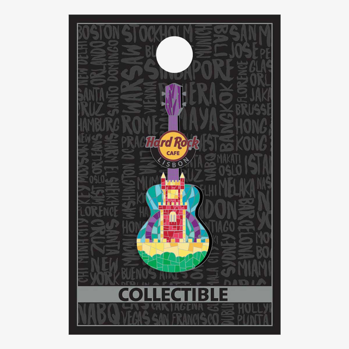 Lisbon Mosaic Castle Guitar Pin Vivid colors abound in this unique mosaic designed guitar pin. The Belém Tower is depicted amongst a rainbow of colors to create the base as purple flows up the neck and into the headstock.